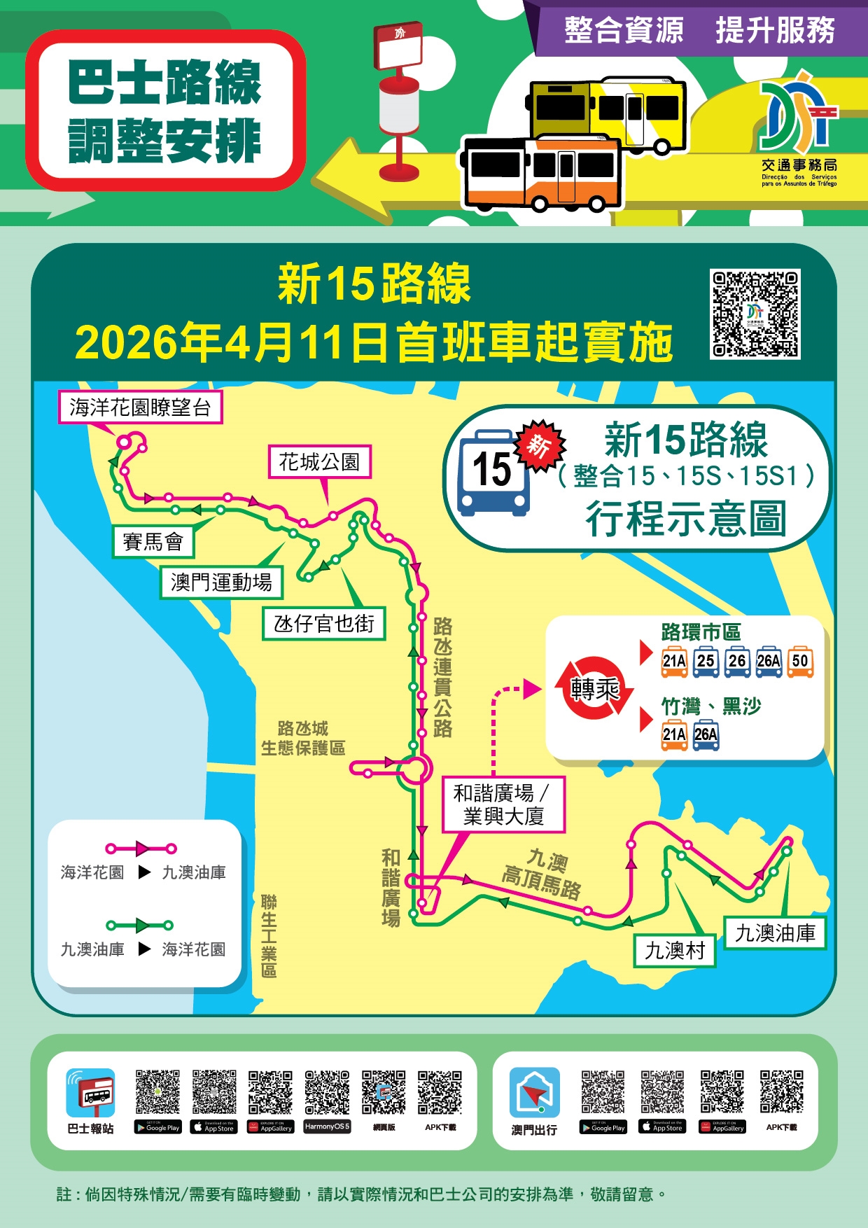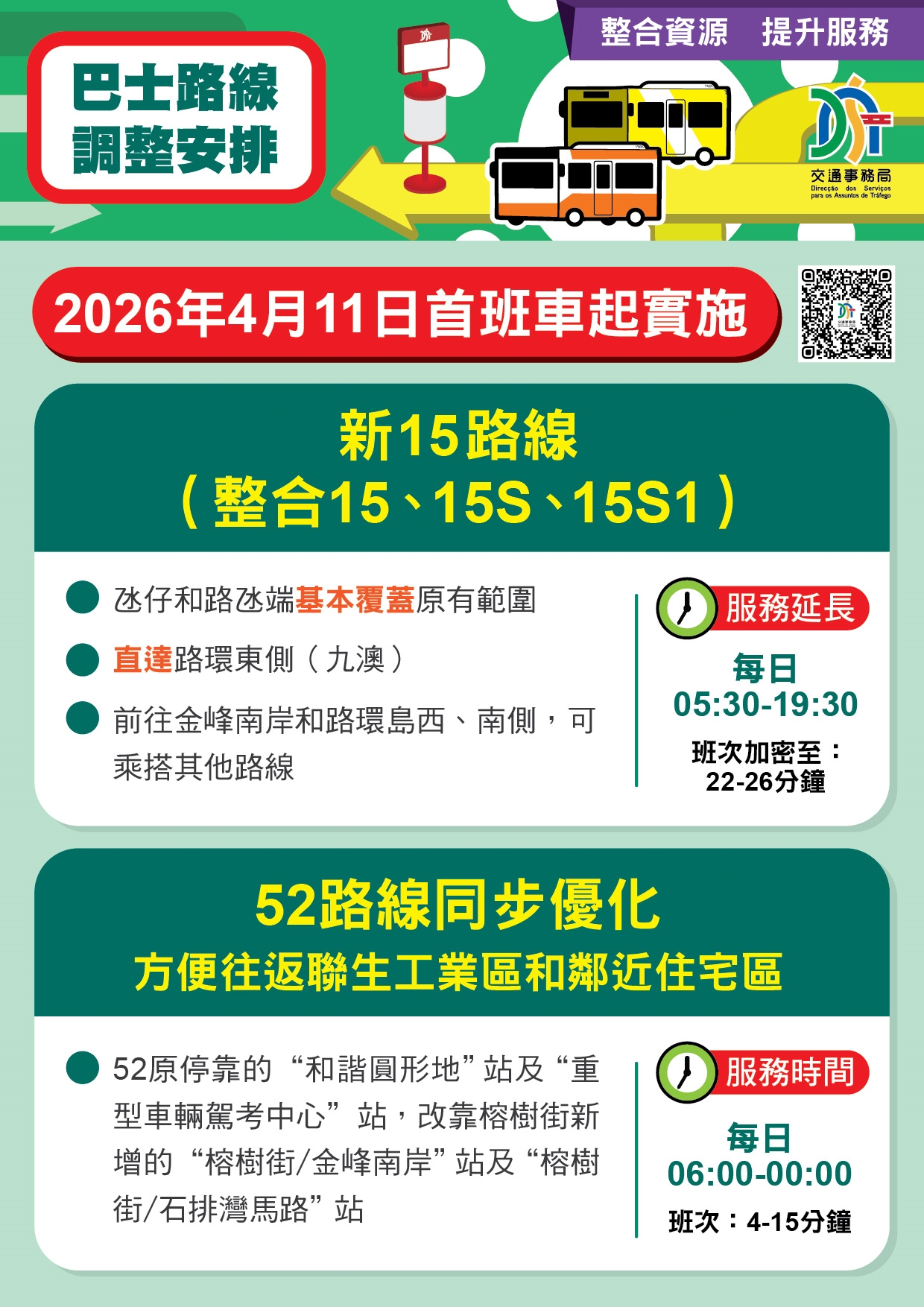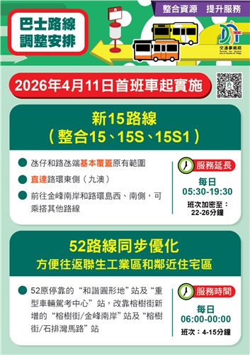 為優化公共資源配置,交通事務局持續透過數據分析客流,並與兩間巴士公司協調,推動路線重組與站點優化。4月11日起將實施新15路線的巴士服務,並調整52路線的行程,透過整合資源、加密班次、擴大覆蓋,為市民提供更便捷的巴士服務。
