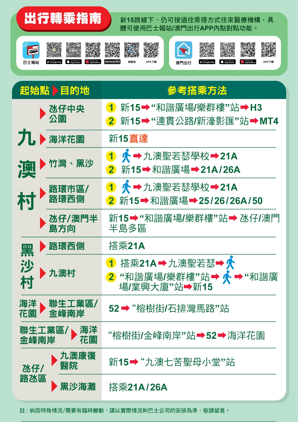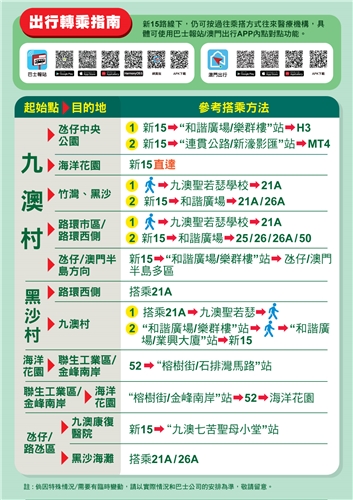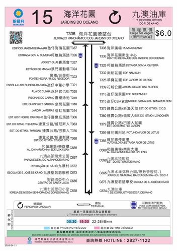 4月11日起,由現時15、15S及15S1路線合併的新15路線將以往返海洋花園及九澳村的路線運作,班次頻率將加密到22至26分鐘(詳情可參閱附圖1、2及3)。當中,將新增往來九澳高頂馬路及九澳油庫的行程,同時,前往路環市區、竹灣、黑沙等區域的乘客,則可透過轉乘其他路線繼續行程(詳情可參閱附圖4)。