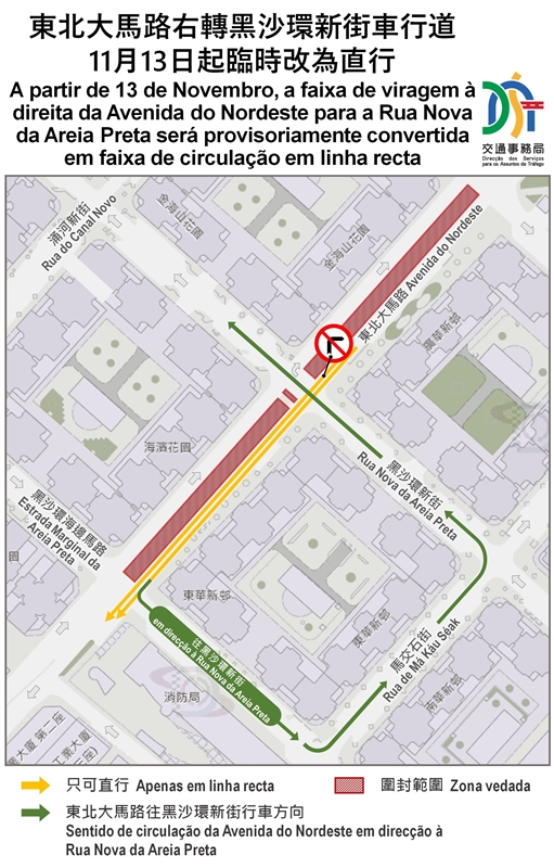 交通事務局與治安警察局持續留意東北大馬路空中走廊建造工程期間周邊各區域及道路的交通情況。因應工程期間東北大馬路每個方向只具備兩線行車條件,經兩局日常留意,東北大馬路與黑沙環新街交界經常出現交通瓶頸,為理順該交界路口之交通秩序,由11月13日上午7時起,臨時將東北大馬路右轉往黑沙環新街的專用車道,調整為只可直駛往慕拉士大馬路方向,以提升路口的交通流暢度。