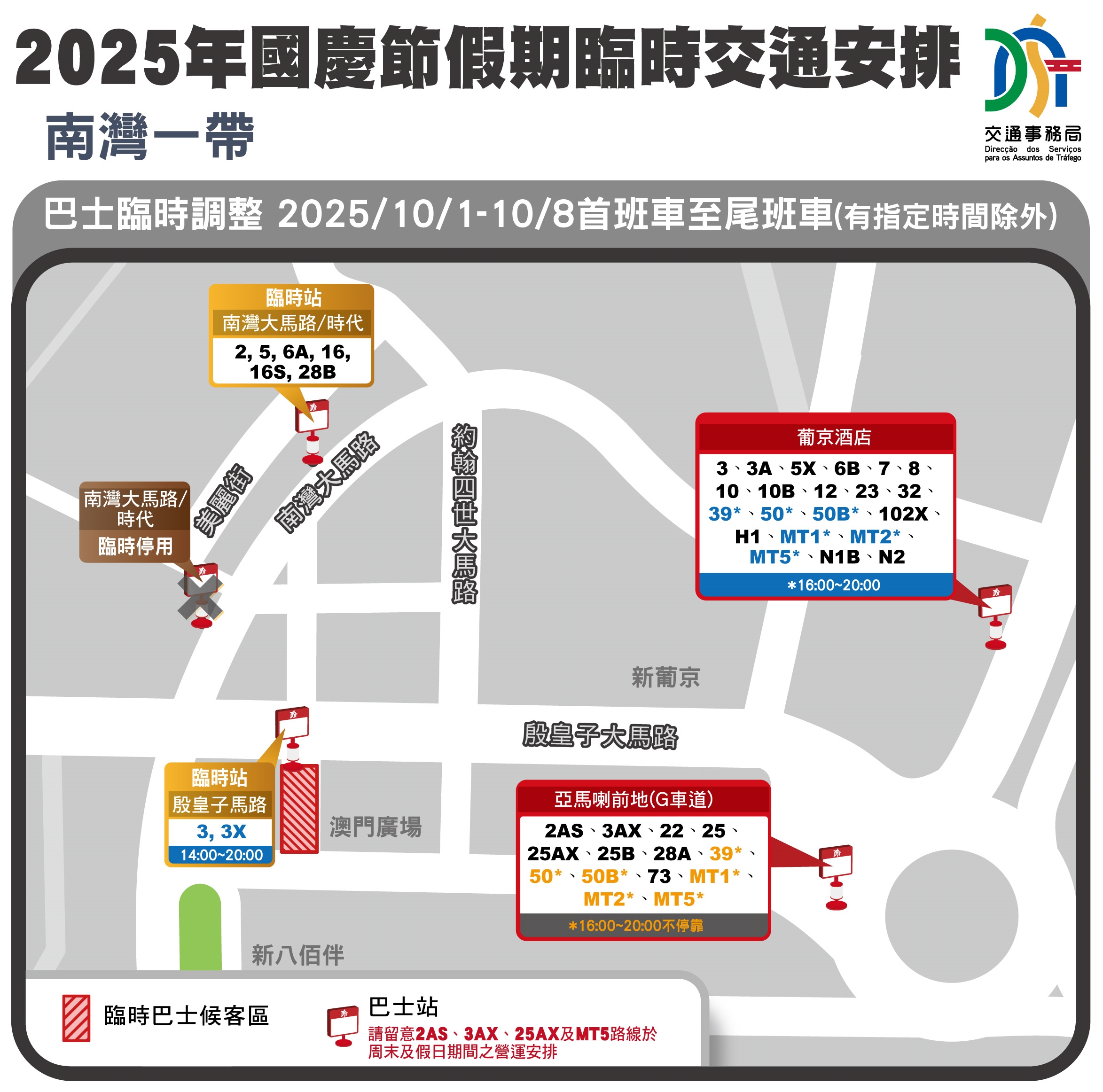 巴士服務方面,參考過往重大節假日的運作經驗並配合時限性節慶活動,交通事務局除繼續維持過往於關閘廣場東側、新馬路、南灣、營地大街周邊、栢港停車場一帶、氹仔舊城區等的臨時分流措施外,是次亦會利用栢港停車場地面層闢作臨時巴士分流站,於10月1日至8日每日下午4時至晚上8時,分流“十六浦"站的1、3、3X、61及MT4路線,以優化候車空間及交通通行緩衝能力;而為進一步理順“亞馬喇前地"站的候車情況及加強周邊道路的疏散能力,於上述同一時段,即10月1日至8日每日下午4時至晚上8時期間,停靠“亞馬喇前地"站(G車道)的39、50、50B、MT1、MT2及MT5路線將改為停靠“葡京酒店"站。另一方面,兩巴因應客流情況增加班次,會於10月1日至8日期間臨時營運時節性及特班車路線3BX、17T、21AT、26AT及101X特班車(101XS),以增強運力、加快乘客疏運。周邊相關道路將同步實施臨時交通管制,具體巴士調整詳情可參閱附表或瀏覽兩巴網站(澳巴:www.tcm.com.mo,新福利:www.transmac.com.mo)。