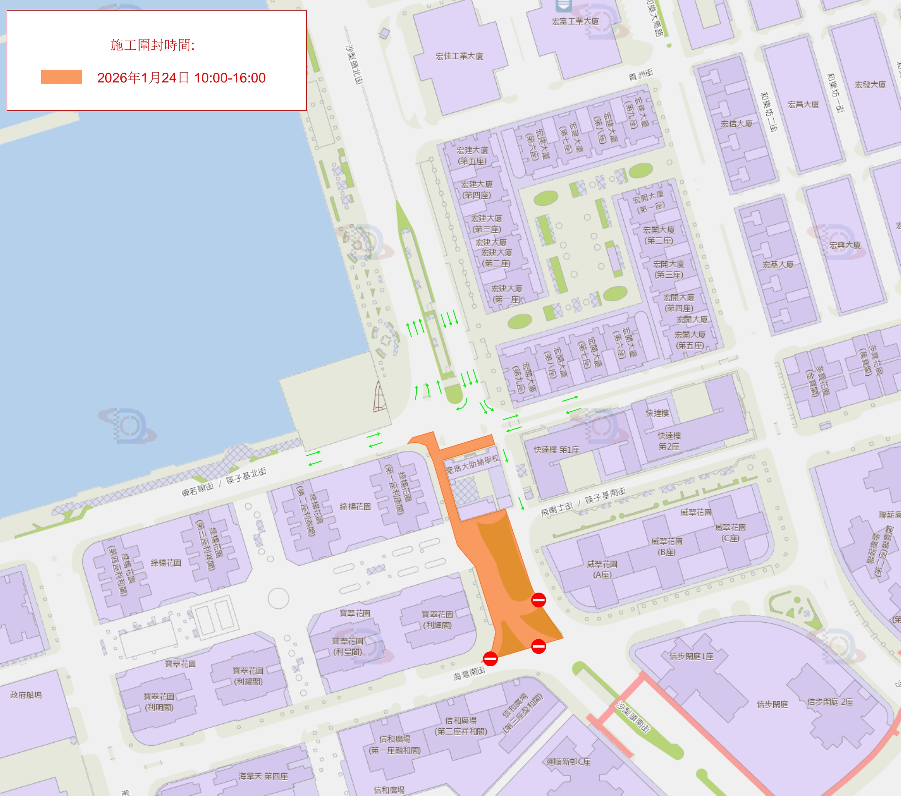 2. 2026年1月24日上午10時至下午4時,介乎俾若翰街至海灣南街的一段沙梨頭南街將實施封閉交通(見附圖2),期間車輛無法經沙梨頭南街直接前往俾若翰街或沙梨頭北街,需改為經海灣南街及船澳街前往,而原來途經該處的公共巴士將實施臨時改道,但不影響停靠站點,敬請市民留意。