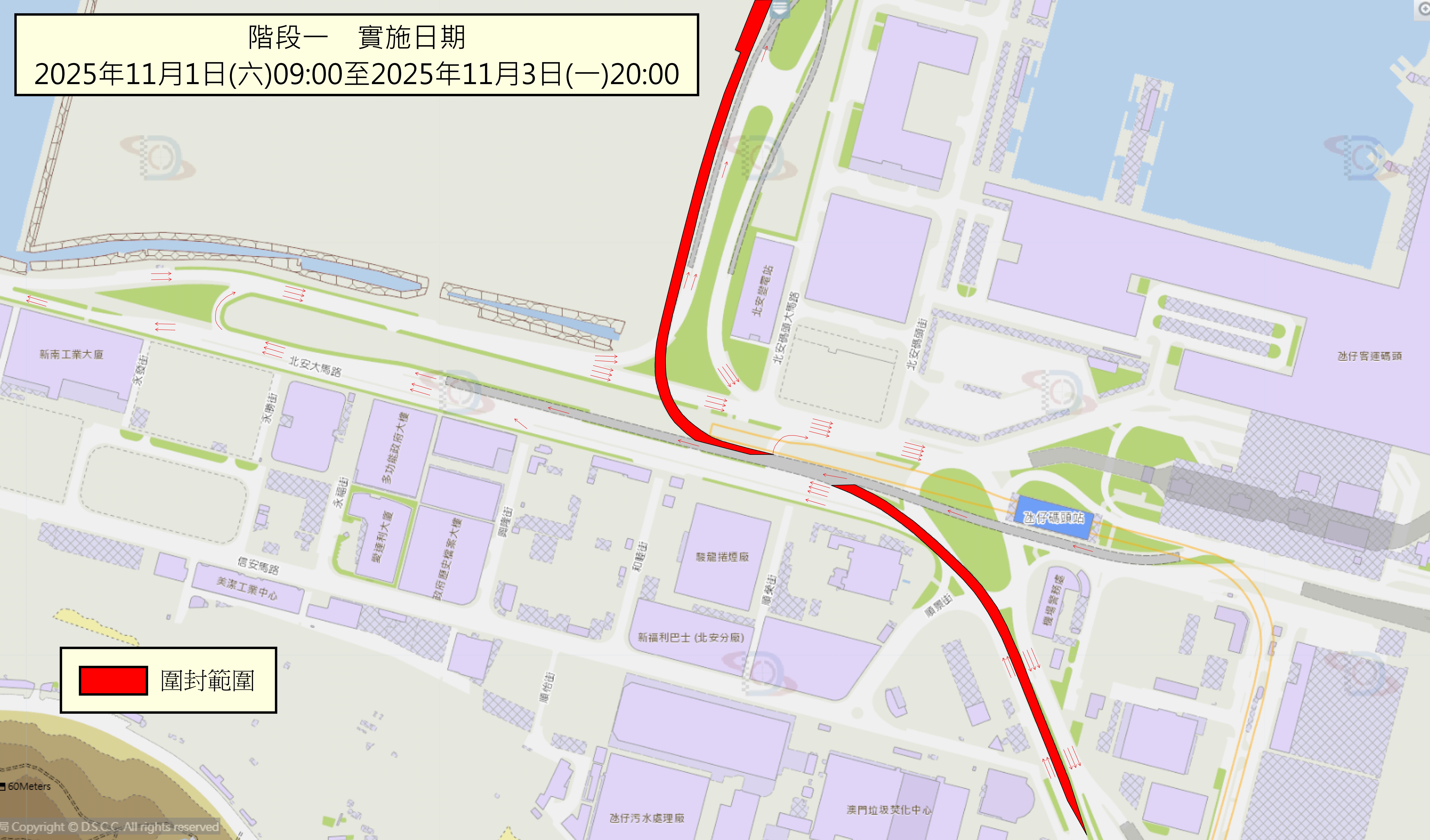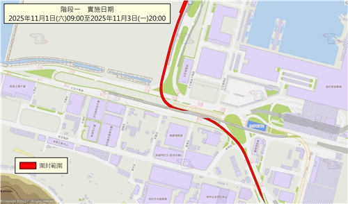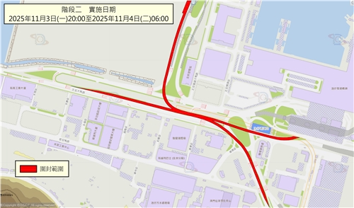 階段一:11月1日早上9時至3日晚上8時,屆時氹仔偉龍馬路往澳門大橋方向的一段引橋將臨時封閉(詳見圖一),駕駛者可前往北安大馬路的調頭處,再前往澳門大橋。