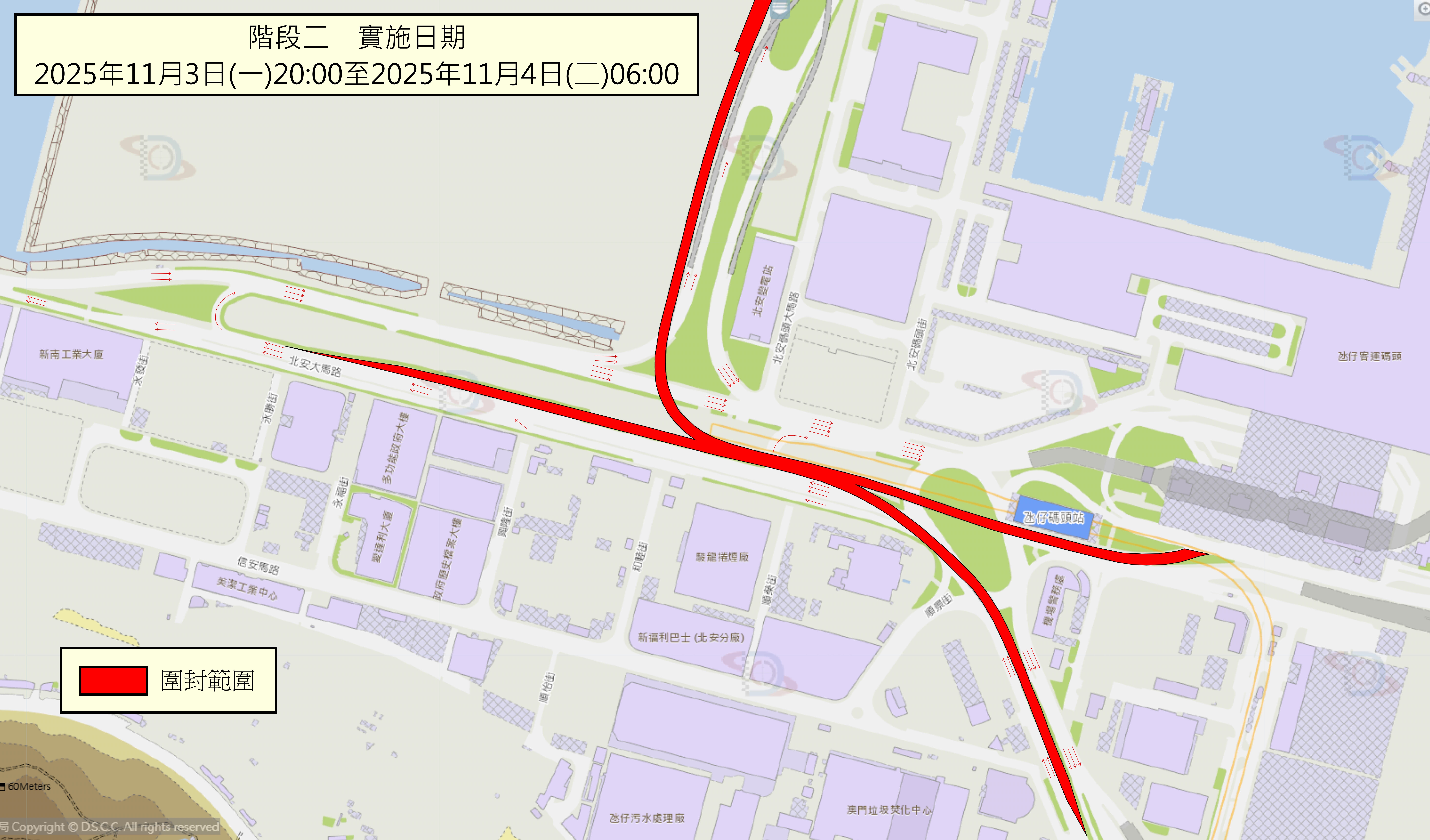 階段二:11月3日晚上8時至4日清晨6時,屆時氹仔偉龍馬路及氹仔碼頭往北安大馬路方向及澳門大橋的引橋將臨時封閉(詳見圖二);車輛須經北安大馬路掉頭前往澳門大橋。