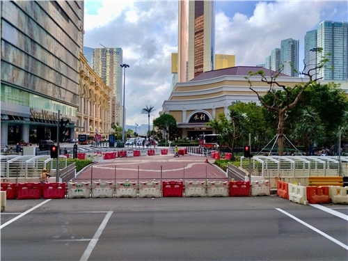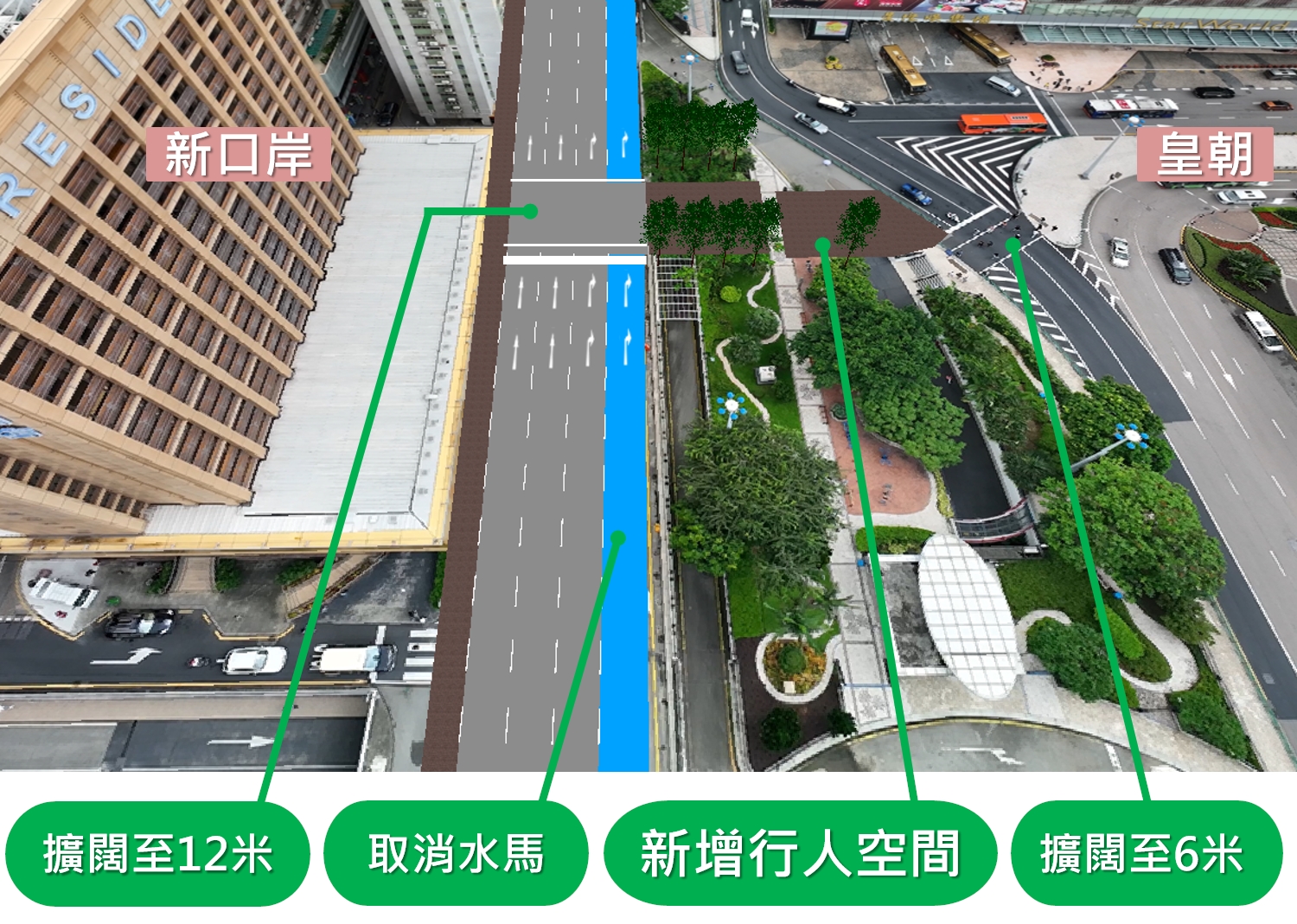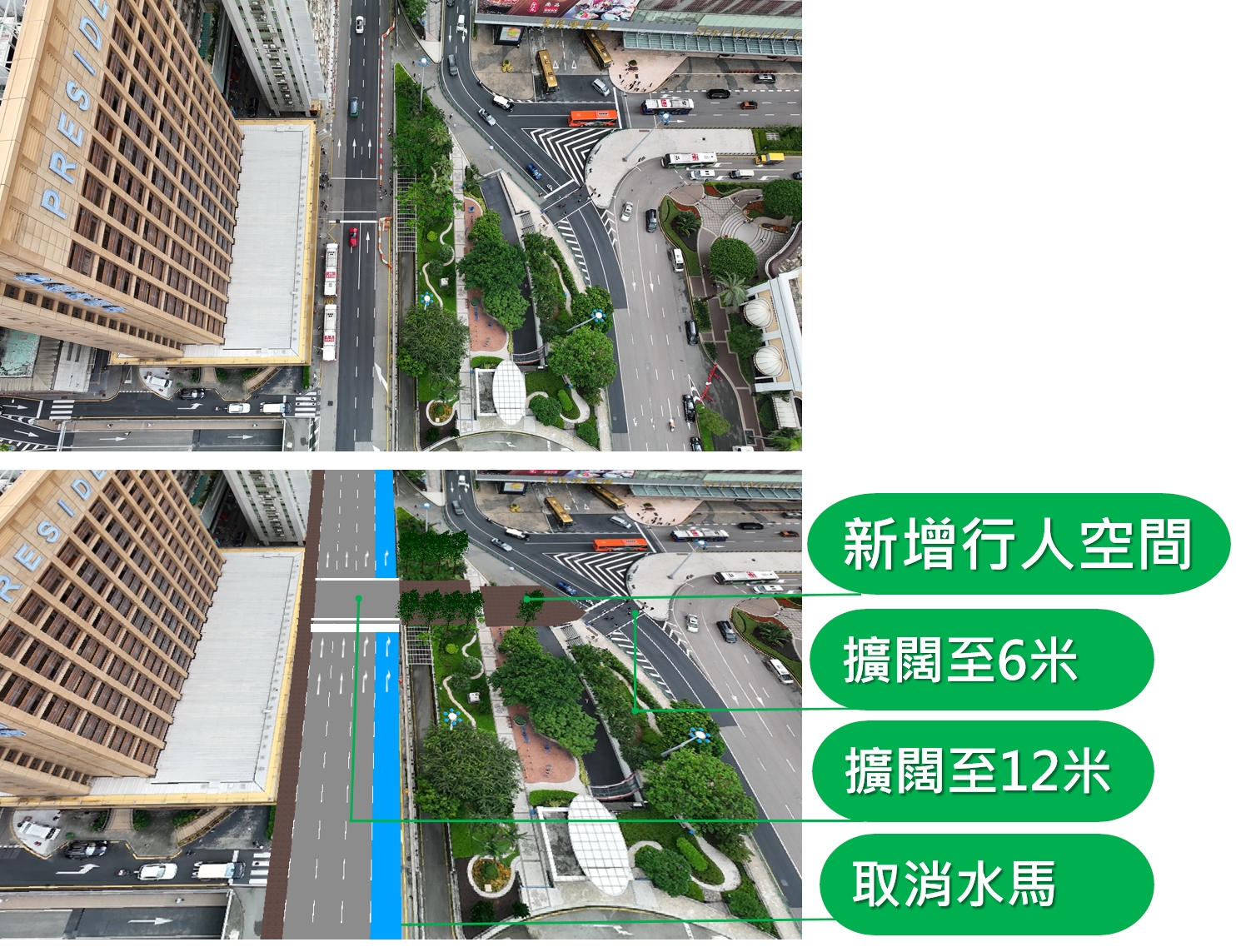面向仙德麗街新增行人空間,行人可由總統酒店前方的人行橫道前往皇朝區
