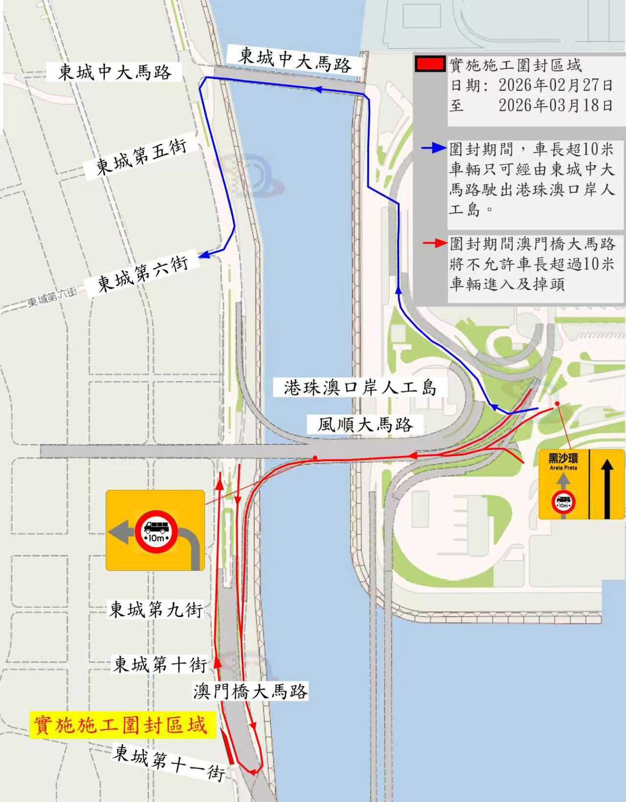為配合新城填海區A區共同管道及道路設計連建造工程-南區項目推進,需於澳門橋大馬路與東城第十一街的交界處進行下水道建造及接駁工作,因此,鄰近東城第十一街的一段澳門橋大馬路將於2月27日至3月18日實施有限度通車,期間部份路段將收窄(詳見附圖);超過10米長之車輛禁止駛入風順大馬路,相關車輛只可經由東城中大馬路駛出港珠澳人工島往A區,敬請駕駛者留意現場指示及禮讓駕駛。