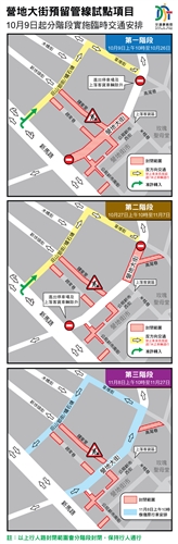 營地大街預留管線試點項目於10月9日起至11月27日進行,為減低影響,經道路工程協調小組(下簡稱“小組”)協調,項目將分3階段進行,其中,第一階段(10月9日起至10月26日)及第二階段(10月27日至11月7日)期間營地大街將分段實施封閉交通,並透過將庇山耶街和草堆街的部份路段改為反向行車,讓車輛能夠到區內上落客貨及進出停車場,保持區內的交通循環,而治安警察局亦會派員指揮交通,維持交通和上落客貨秩序;第三階段(11月8日至11月27日)施工範圍集中在區內的內路,因此,原封閉交通和反方向行車的營地大街、草堆街和庇山耶街將於11月8日上午10時起恢復原有行車安排(具體請查閱附表1及附圖1)。