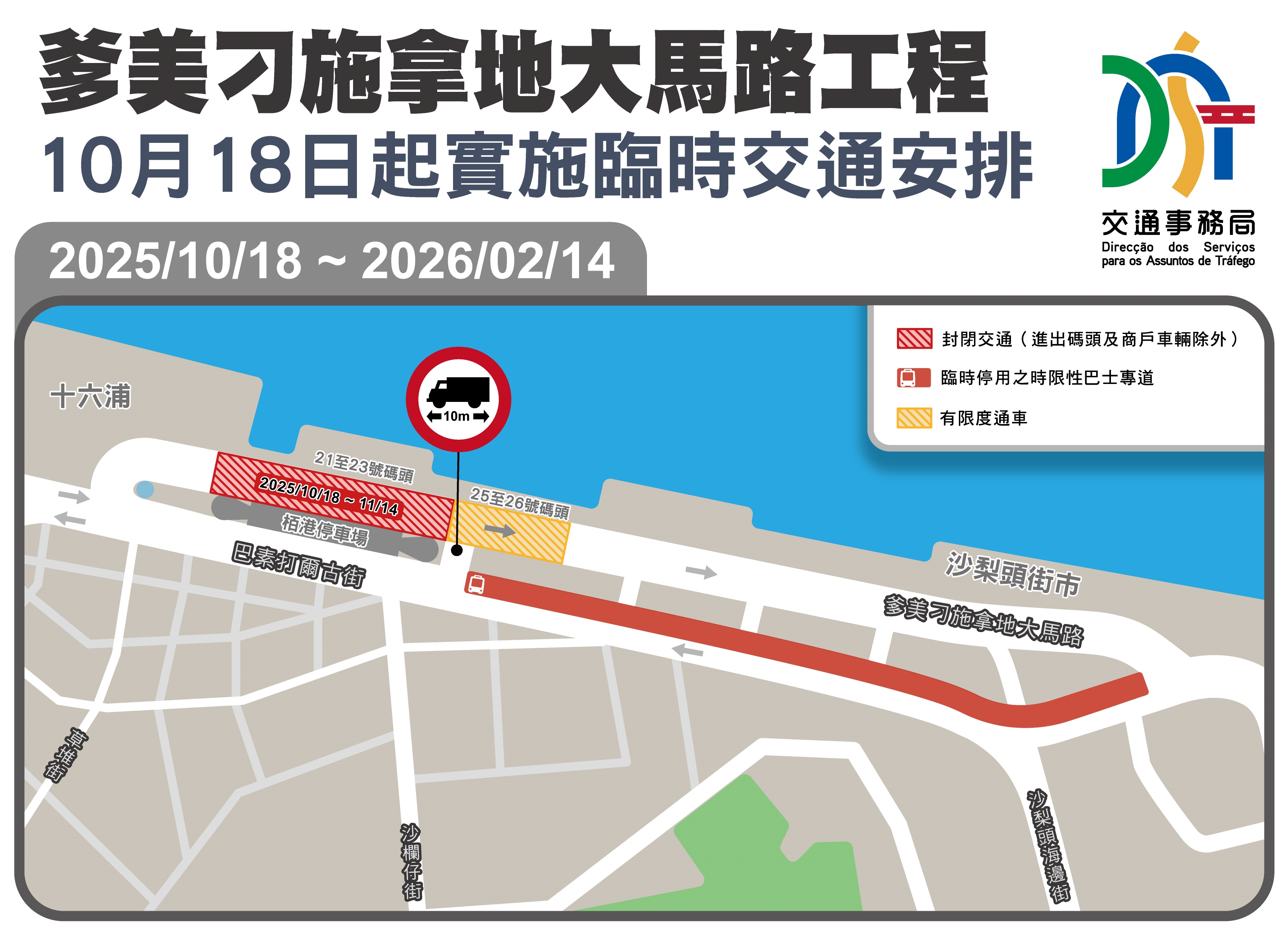 因進行內港北排水系統整治工程、23和25號碼頭活化計劃,以及新建大廈之接駁渠道工程,經特區政府相關部門跨部門協作及與各專營公司溝通協調,10月18日上午10時起,爹美刁施拿地大馬路部份路段將實施臨時交通安排,以配合各單位進行合併施工,施工期約為五個月。為減少工程期間對周邊交通的影響,屆時巴素打爾古街近栢港停車場出口至典雅灣對出的一段時限性巴士專道將臨時停用,開放予所有類型車輛通行。