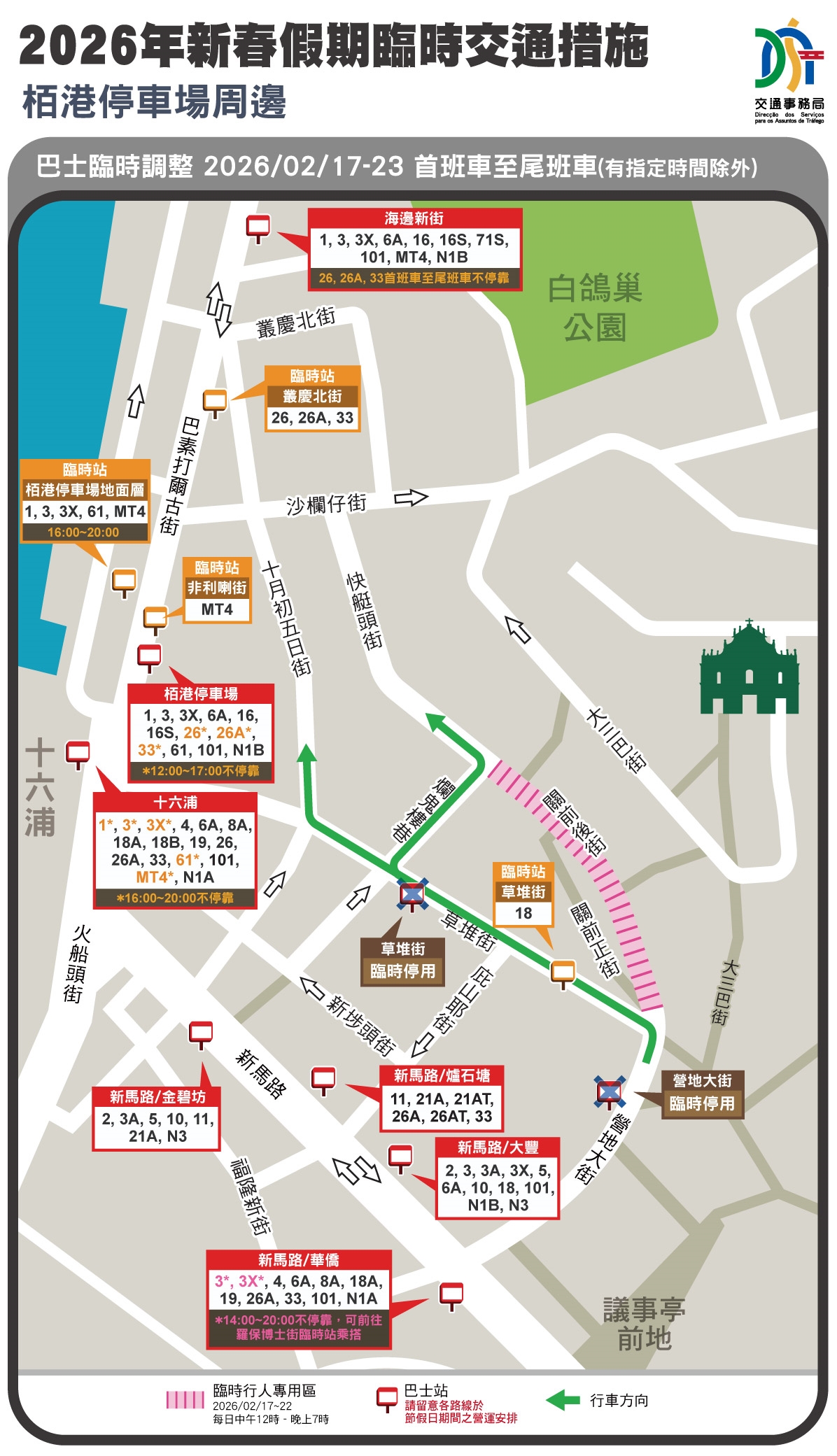 交通事務局呼籲公眾新春期間盡量使用公共交通,並透過官方手機應用程式、網頁或微信查閱即時交通訊息,並留意局方公佈的最新安排,提前規劃行程。巴士服務詳情可瀏覽兩巴網頁(澳巴:http://www.tcm.com.mo、新福利:http://www.transmac.com.mo)。