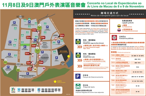 澳門戶外表演區將於11月8日至9日一連兩天舉辦演出活動,預計每日上午約11時半開始進場,至晚上約10時結束。配合演出安排及觀眾往返場地需要,表演區周邊道路將實施臨時交通管制措施,並會臨時調整公共巴士路線、提供特定時段和站點的輕軌免費乘車服務及適時調整列車班次、設置免費接駁專車,以及增設臨時行人區等,以提升整體運載效率及協助人潮離場。