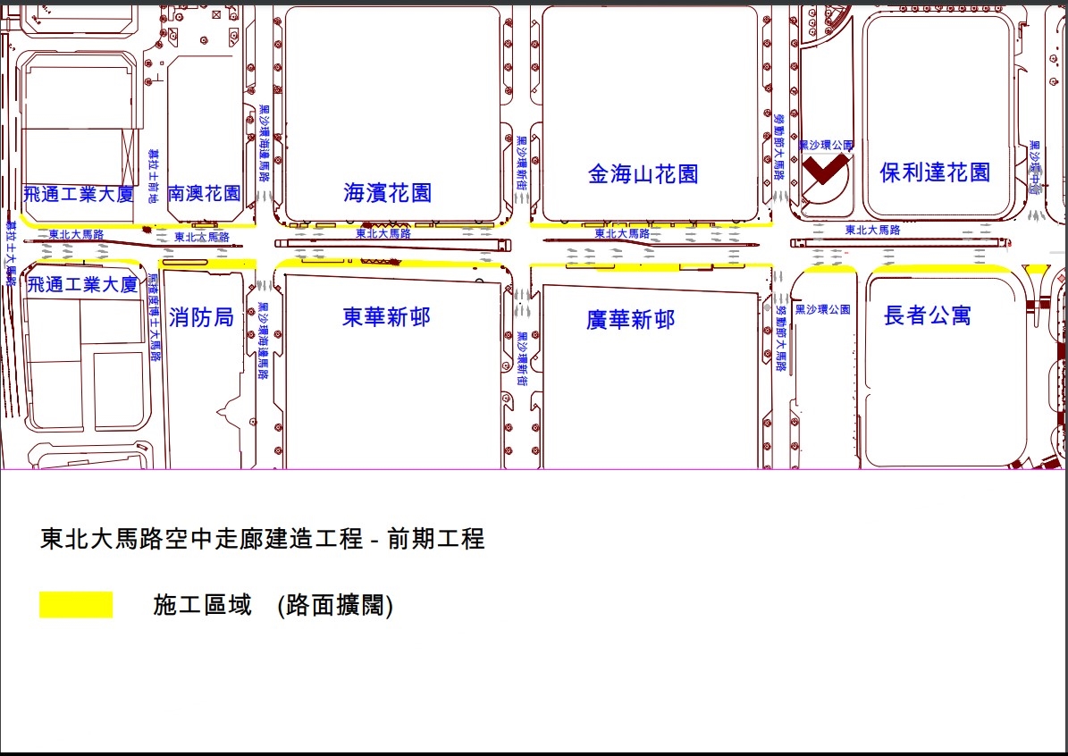 東北大馬路空中走廊前期道路網工程已於2023年12月於部份路段展開施工,隨著工程推進,東北大馬路其餘路段將陸續展開行車路擴闊、移植樹木、遷改交通設施及遷改市政設施,以及進行地質鑽探等工作,期間慕拉士大馬路與黑沙環中街之間的一段東北大馬路將配合施工需要而實施有限度通車,請駕駛者留意現場交通指示,工程涉及的施工路段(詳見附圖),道路網前期工程預計於2024年5月完工,以配合空中走廊主體工程隨後的展開。