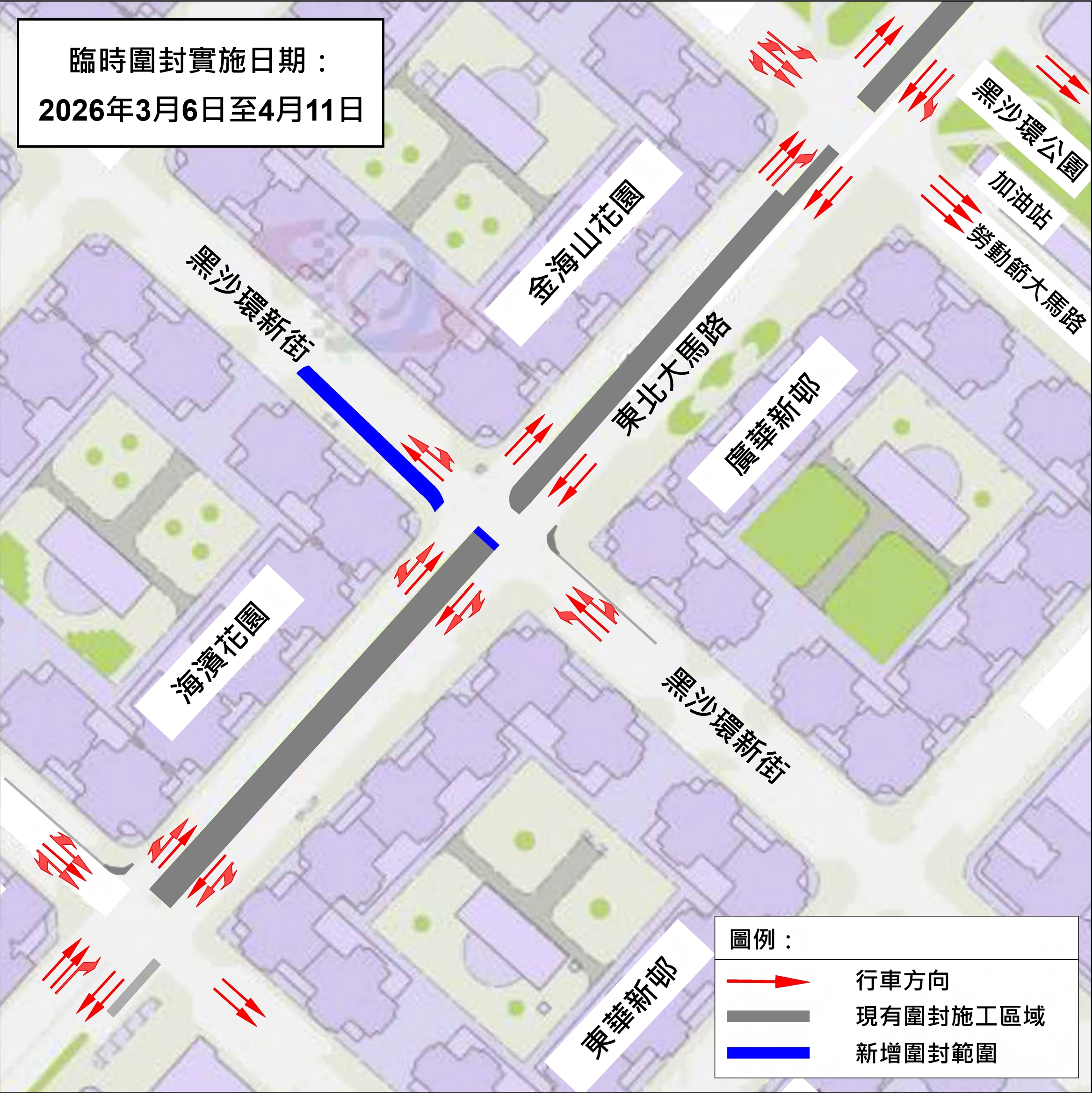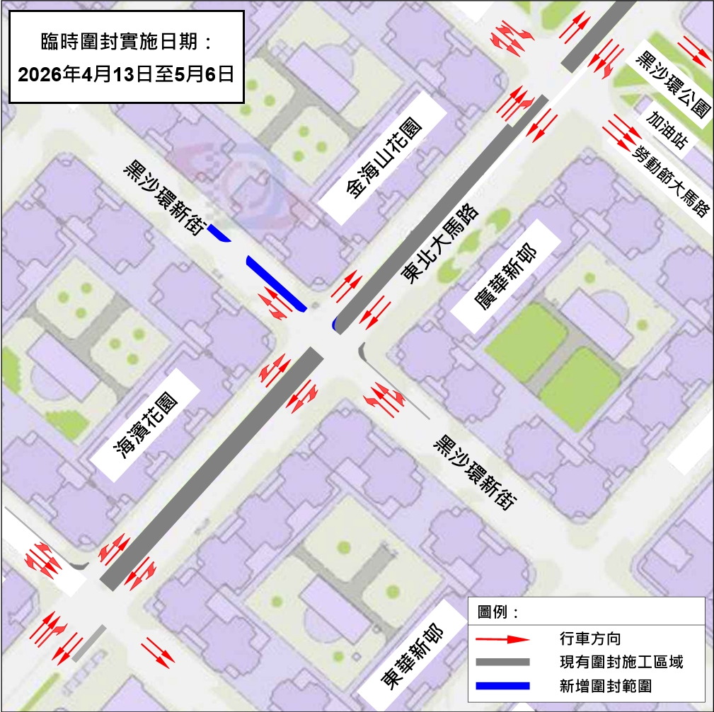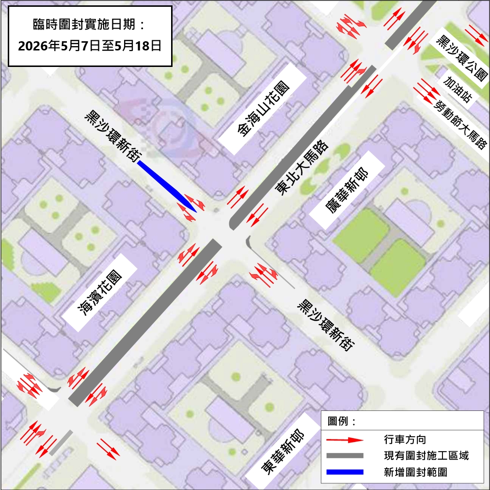 為此,公共建設局與交通事務局經協調後,預計由2026年3月6日起,分三階段對海濱花園與金海山花園之間的一段黑沙環新街(近東北大馬路區域)進行局部圍封,並實施有限度通車,以保障東北大馬路與黑沙環新街交匯處至少保持雙線行車(具體安排見附圖)。