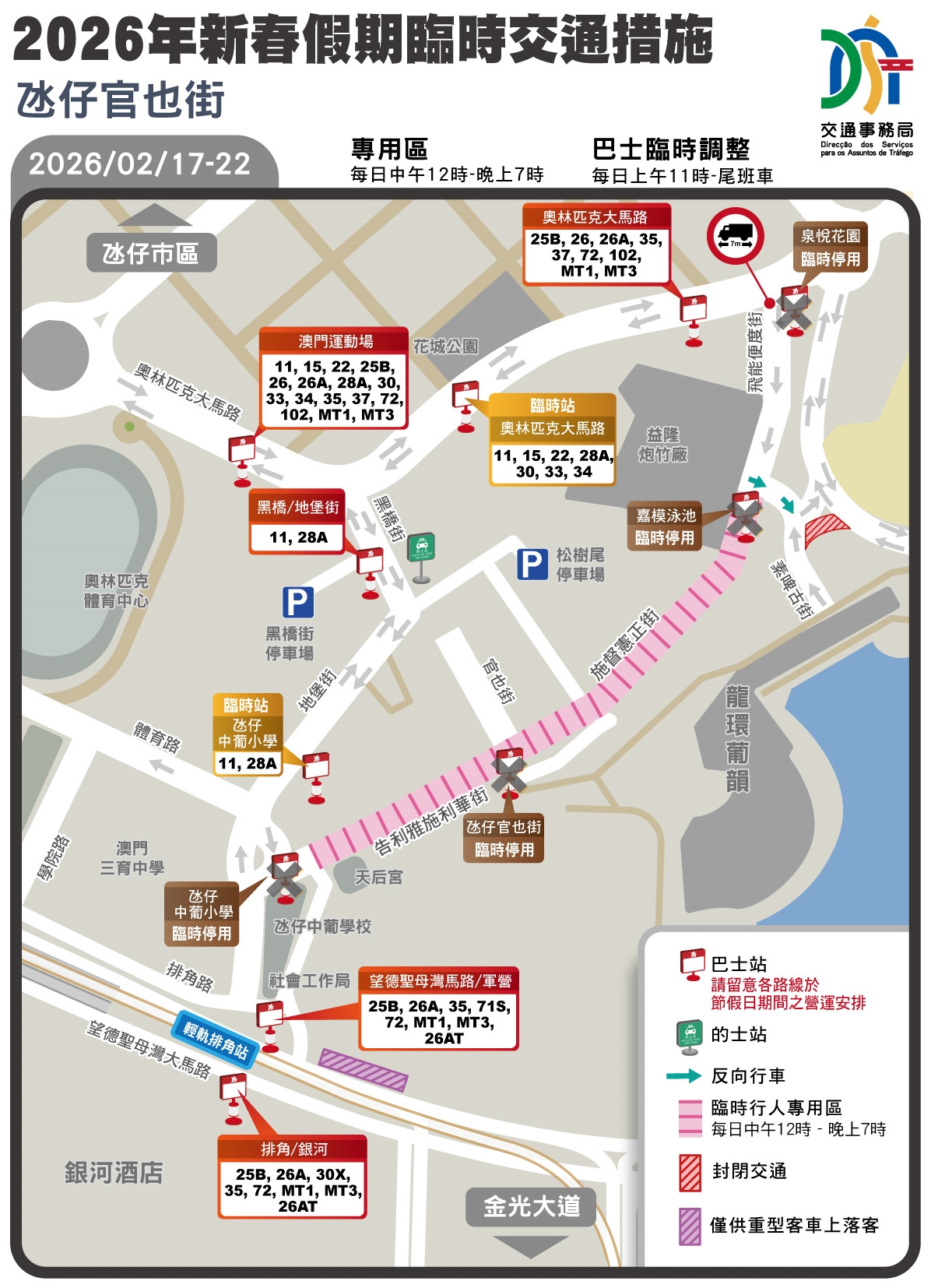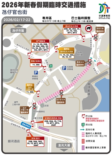 - 為營造更舒適安全的出行環境,政府於新春期間,繼續在關前後街及氹仔舊城區設置臨時行人專用區,相關詳情可瀏覽:https://www.dsat.gov.mo/dsat/news_detail.aspx?a_id=617456C95711CC93EB4D253B264034A1。