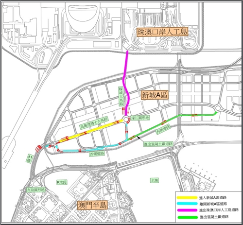 新城A區西側道路將於2024年2月4日開通,屆時由珠澳口岸人工島經濠江圓形地進出新城A區及澳門半島的車輛需使用西側道路,而目前用作進出珠澳口岸人工島及新城A區的馬萬祺博士大馬路將改作單向行車(詳見附圖1),是次的交通通行措施主要是配合新城A區的規劃及發展,同時為A區北區及中區下一階段在馬萬祺博士大馬路及豚城大馬路進行共同管道及道路施工創造條件,請駕駛者留意現場交通指示及改道後的行車路線。