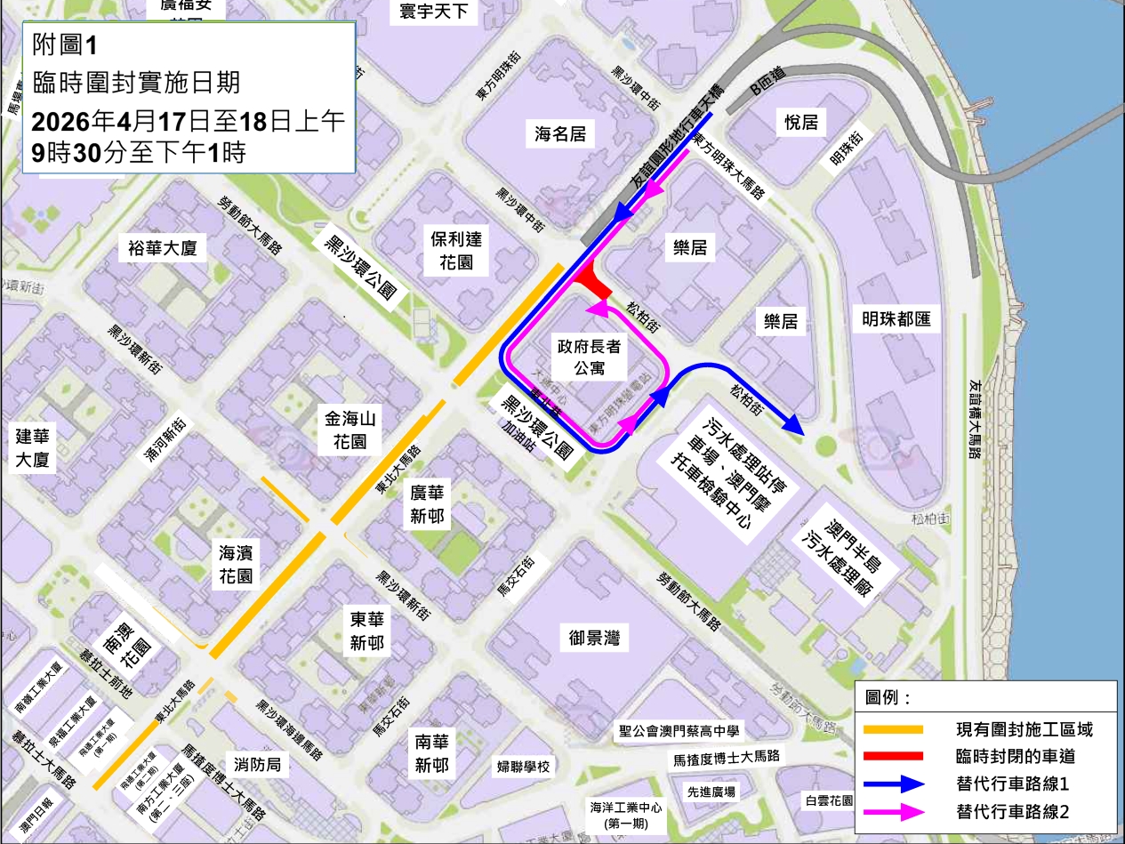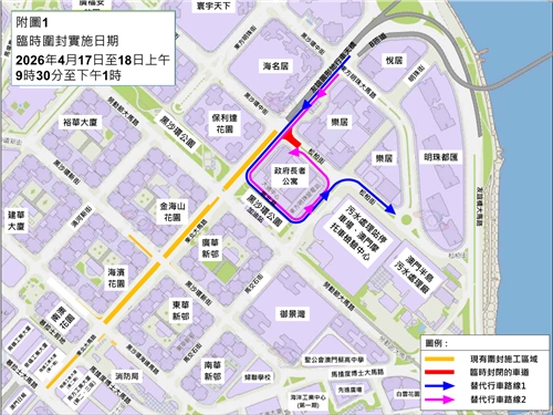 公共建設局及交通事務局呼籲公眾提前掌握即時交通訊息,提早規劃出行路線,現場亦會架設指示牌,敬請駕駛者留意及諒解。