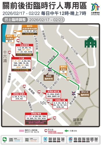 巴士服務方面,為配合行人專用區及節假日臨時分流安排,氹仔舊城區及關前後街周邊的巴士站點及路線實施以下臨時調整: